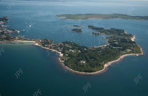 An aerial view of Penzance Point and Devil's Foot, Ram and Nonamesset Islands in Woods Hole, Massachusetts. (3Mb file).
