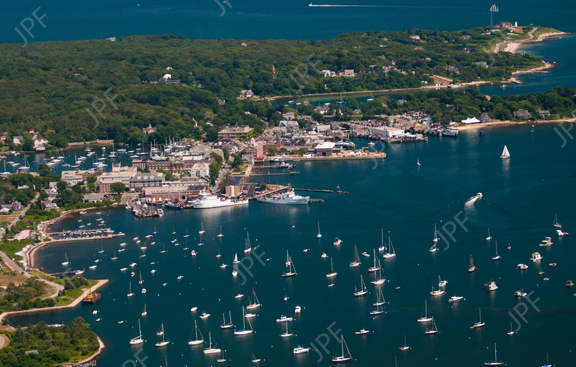 An aerial view of Woods Hole Massachusetts showing WHOI, MBL, the Fisheries and Nobska Point. (8Mb file).