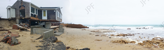 A photomontage showing a house and shore severely eroded by a strong coastal storm. The force of the storm driven waves destroyed the concrete foundation of the house. Sand tubes are being placed on the beach in an attempt to protect neighboring homes. (12Mb file size) |