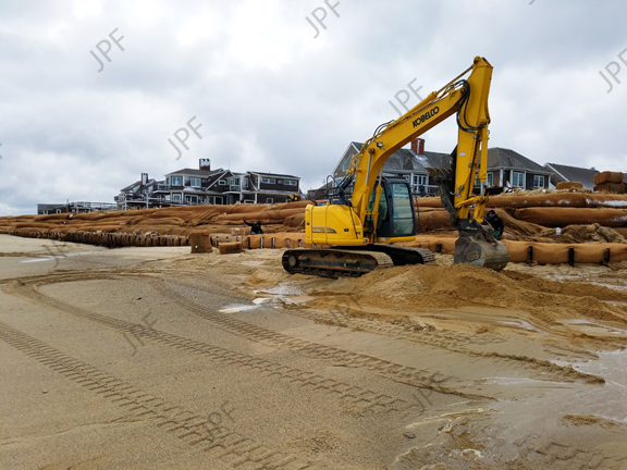 Heavy equipment is often required when placing sand tubes to mitigate coastal erosion effects. Here a backhoe is used to fill, place and pin sand tubes in front of threatened seaside homes. (7Mb file size)