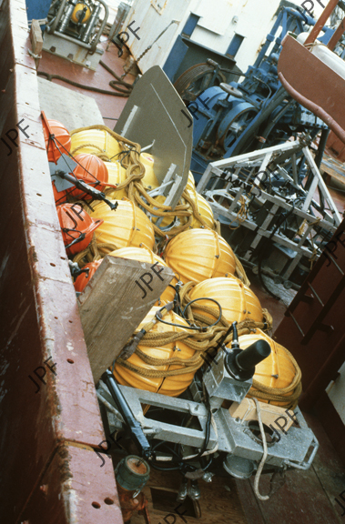 An early sonar tow fish used in deep ocean surveys. The weight of the electronics is offset by buoyant hollow glass spheres. (3Mb file).