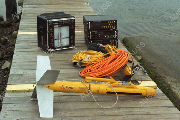 An oceanographic coastal side scan sonar system including electronics, tow fish and cable. (3Mb file).