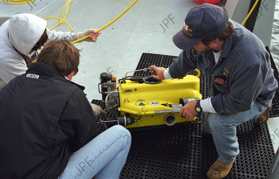 The TV camera behind the front dome and the lights beside it, allow the electric ROV to record video of targets on the seabed. (3Mb file).