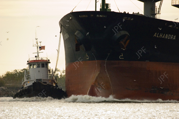A harbor tug is in a precarious spot as she helps guide a tanker in Sabine Pass, Texas. (3Mb file).
