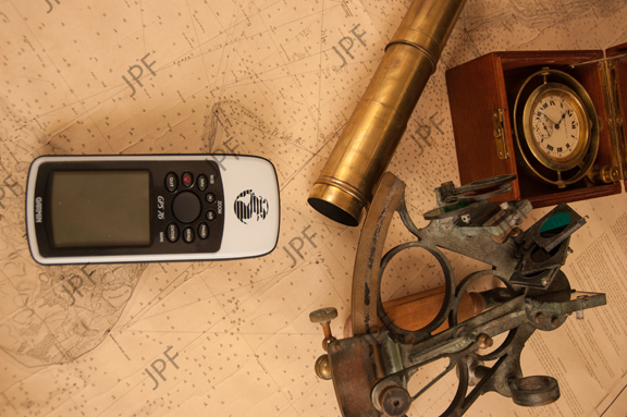 Examples of navigation instruments and nautical charts and a modern GPS or Global Positioning System. (3Mb file).