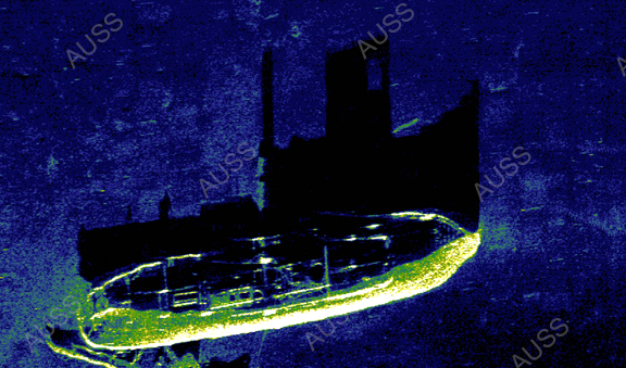 Side scan sonar sonograph of a harbor tugboat showing deck details in the image's shadow. Date of loss unknown. Valparaiso, Chile. (1Mb file).